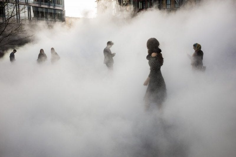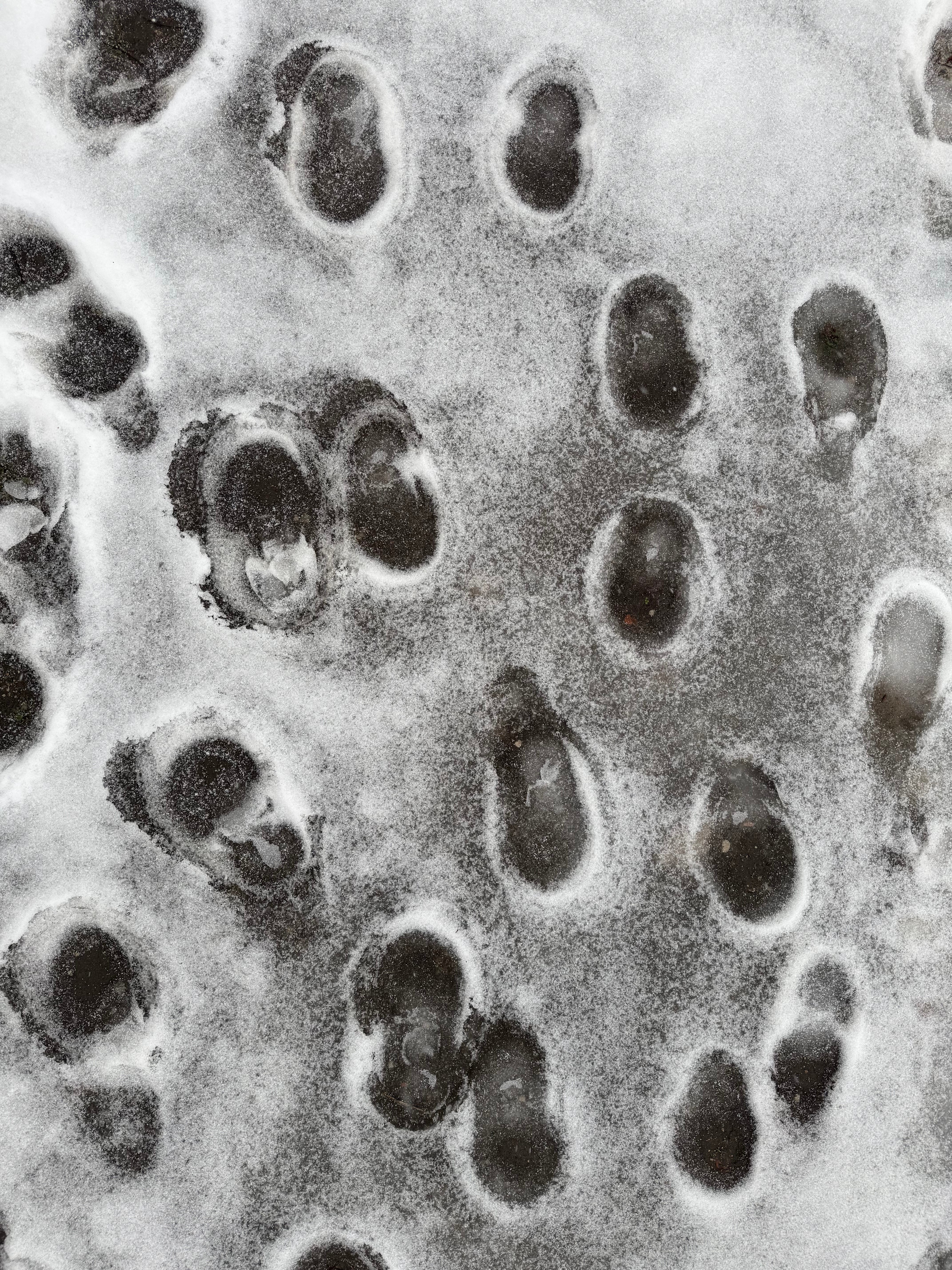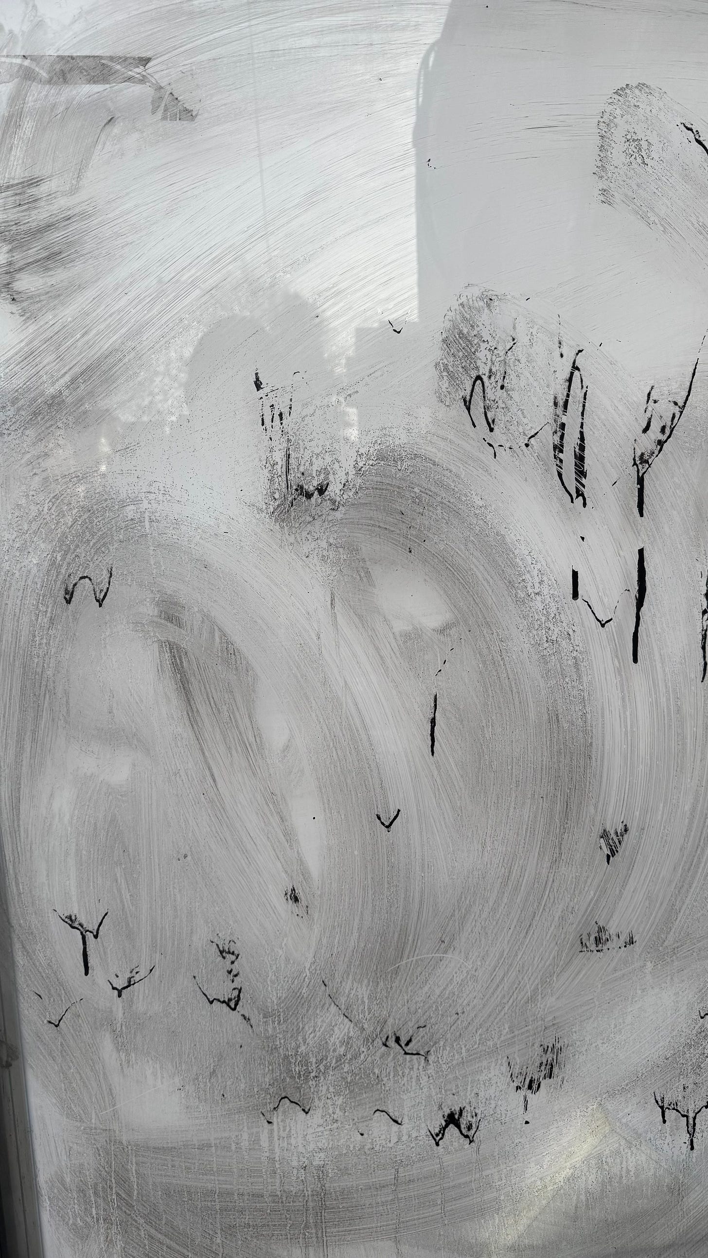 A day where you can barely see in front of you says look harder. Haze doesn’t just cover over it also blurs hierarchy gently erasing the binaries of light and dark. Its soft invitation is the peace of not quite knowing. It is winter thick with fog. You rub your eyes, shiver, look closer. You are alive in this looking. But you won’t quite get it. Nothing is going to be illuminated in this luminous grey. This sort of dustiness has no end-state it is all becoming. Chalk with it millions years of sleeping sea-shelled creatures compacted into glittering white does this. Dusty hazy watery inks do this. A day without a skyline offers this. This gift.