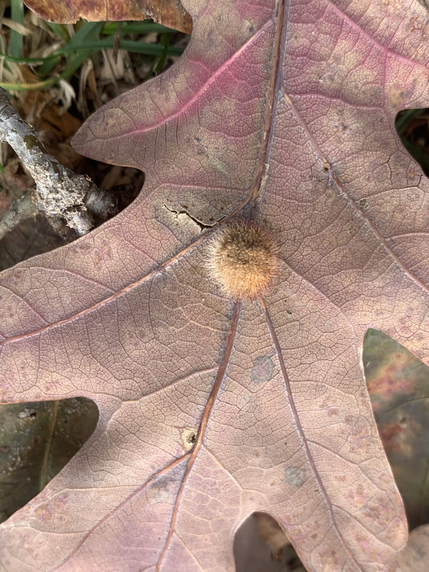 It was last weekend that I found it. I’d been looking for things to collect for the last details of my children’s book and I was on my bike in the old oak Savanah not far from my home I needed a branch of buckthorn with its berries and sassafras leaves, some vines and handful of pinecones and I was hoping to find two little oak leaves making a Y shape on a branch. According to the plan in my head, the oak sprig needed to have the round-lobed leaves not ones with the rough spikier shape and have that bronze shimmer that oak leaves get just before they let go and fall. And I was dead tired. And the oak trees were old-trunked with leaves way up in the blue sky and acorns all around but no saplings. I got back on my bike figuring at least I could find the sassafras grove and then I stopped because there was a huge branch split off from the trunk and the leaves were all bronzed dead. The glint caught my eye and I parked my bike and started looking for just the right little sprig for my project. At first I saw the tawny balls of fluff on the leaves, and then looking up higher, something that was not quite an acorn but about that same size and clamped onto a thin branch or really emerging from the branch and it took me a moment because you don’t often see the larger ones in my city but of course it had to be. And how almost uncanny is this little hard sphere, this woody bark-berry thing.