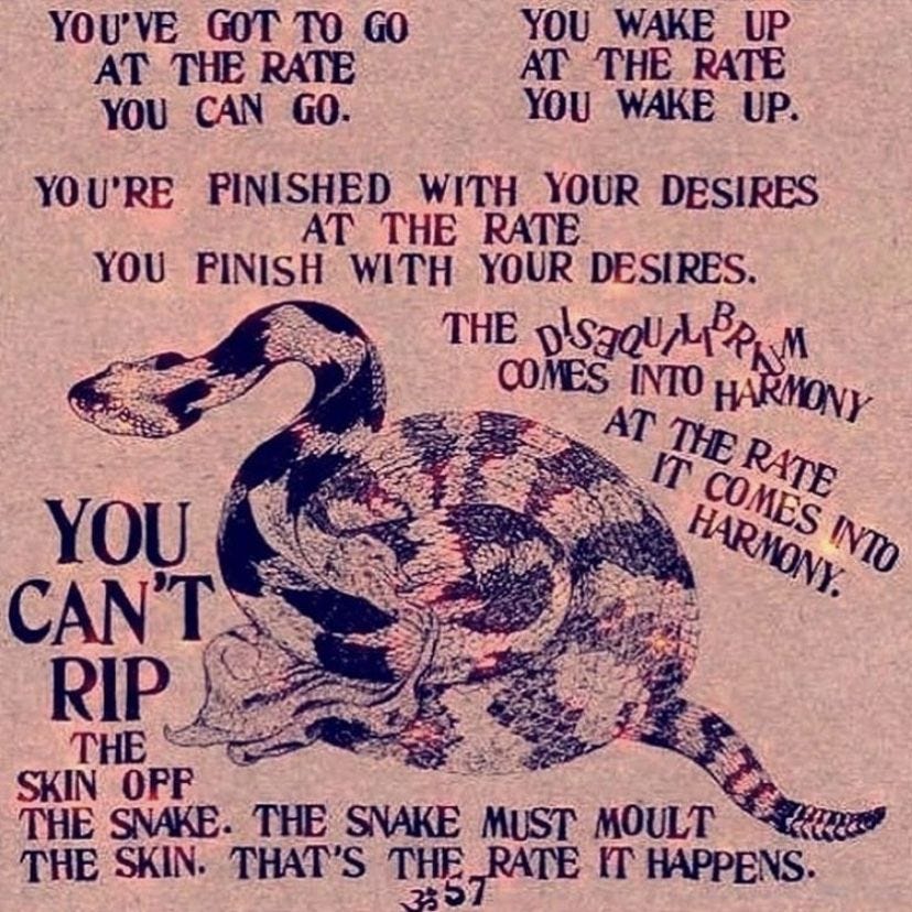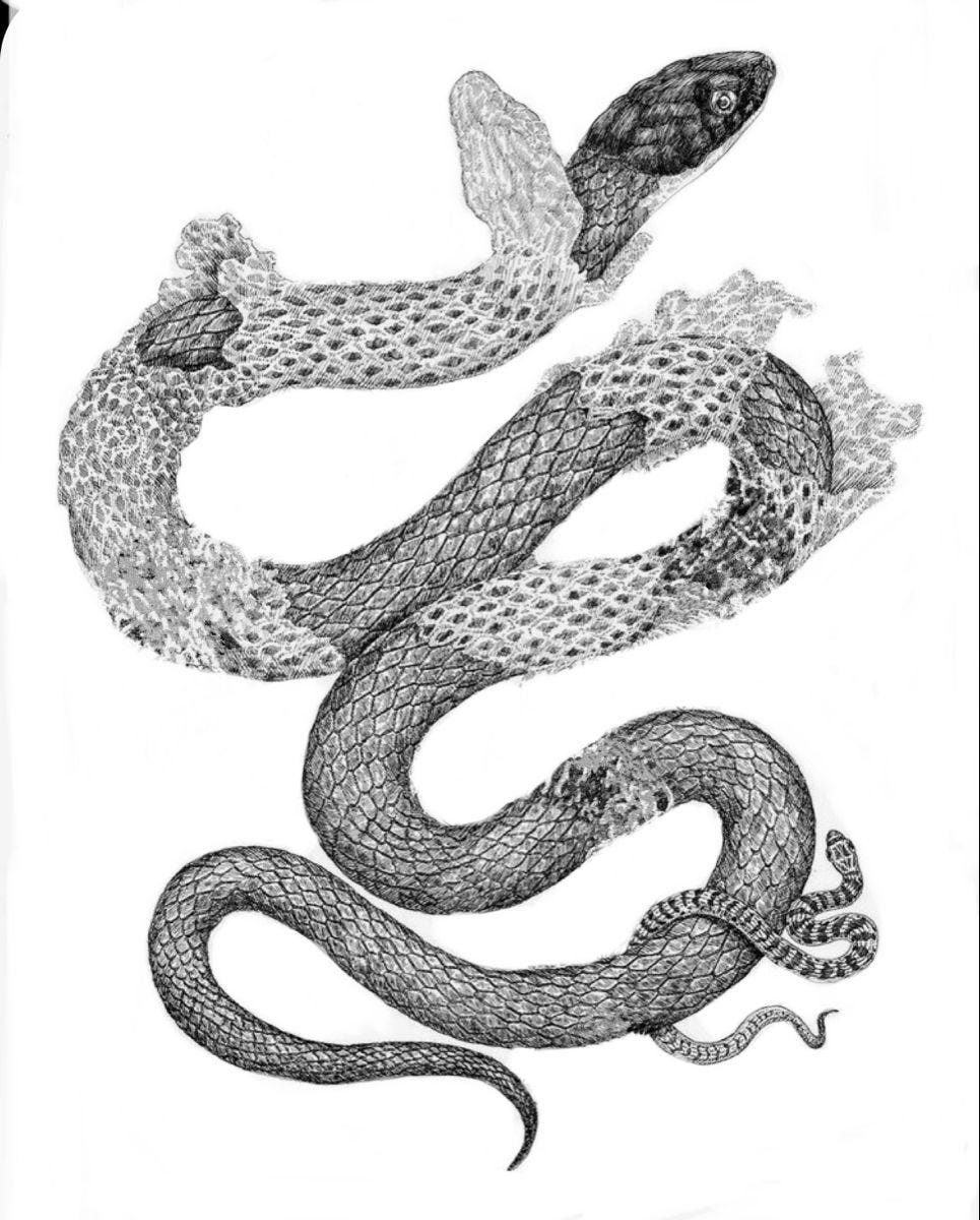And so, to the shedding. Young snakes can grow out of their own form more than ten times a year. It comes on first as a dullness of temper then their eyes go milky blue and then they rub their head against something rough to rip open up the old skin which they peel back turning it inside out to wriggle free from the twisted sculpture of their old self.
